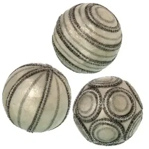 Set 3 bolas decoración nácar blanco cordón plata vieja (10d cm)