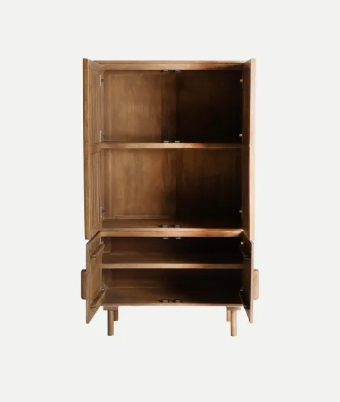 En ella encontrarás este elegante armario ,fabricado en  madera de mango acabado en un bonito marrón veteado.Equipado con cuatro puertas.Las superiores de mayor tamaño son de madera maciza y las inferiores de tablones verticales.