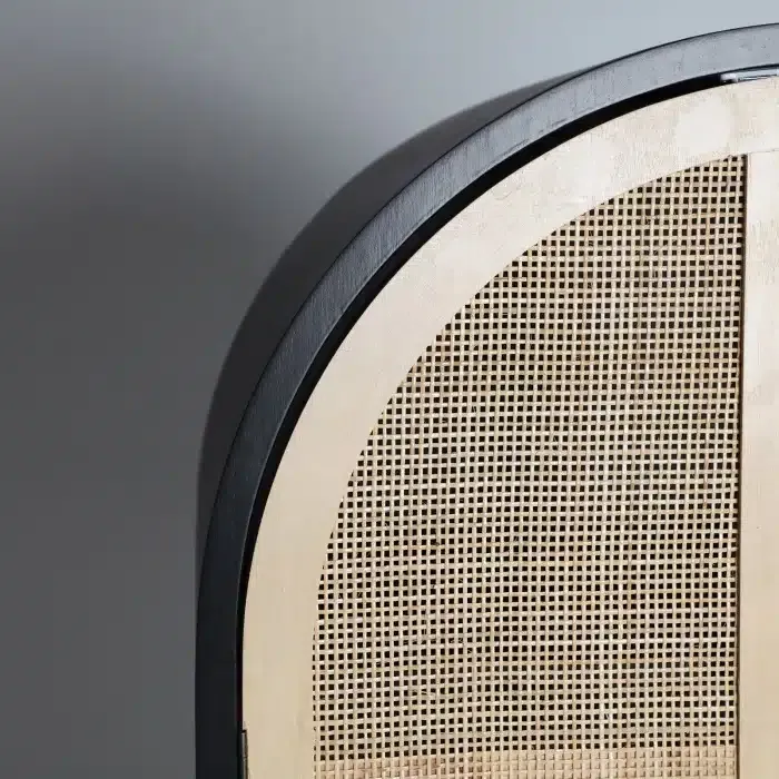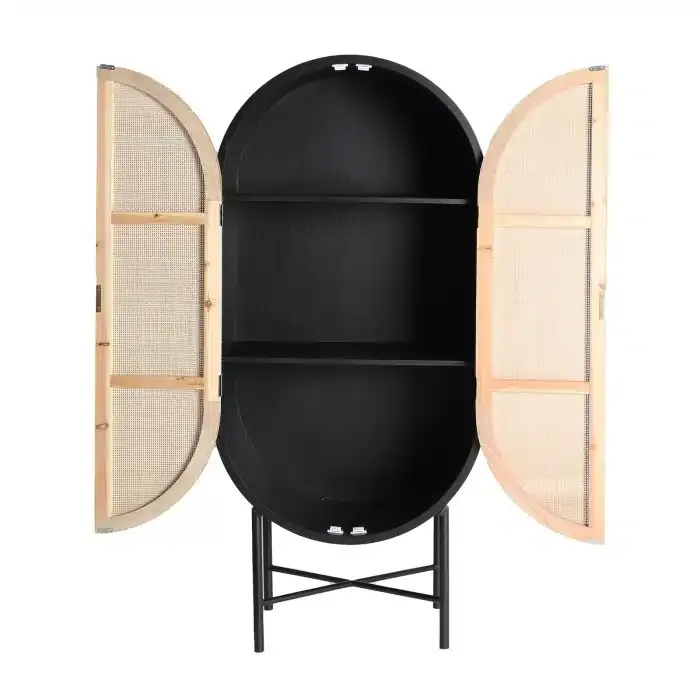 Armario de estructura ovalado en pino negro y ratán .Equipado con estantes interiores. Estilo nórdico.