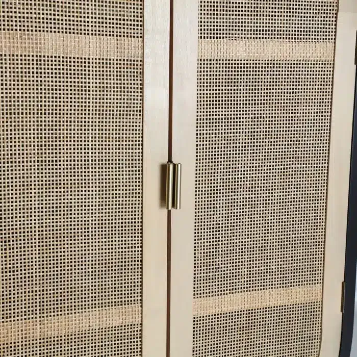 De estructura ovalada, está fabricado en madera de pino-dm con acabado en negro y ratán en el frontal de las puertas.