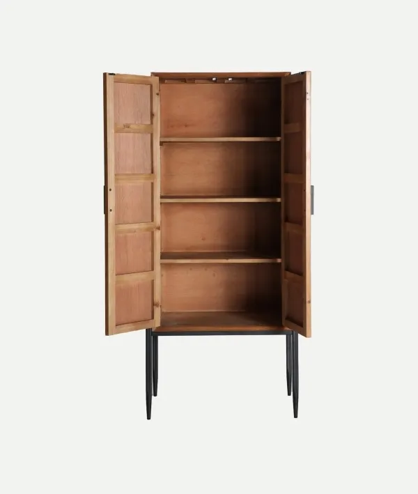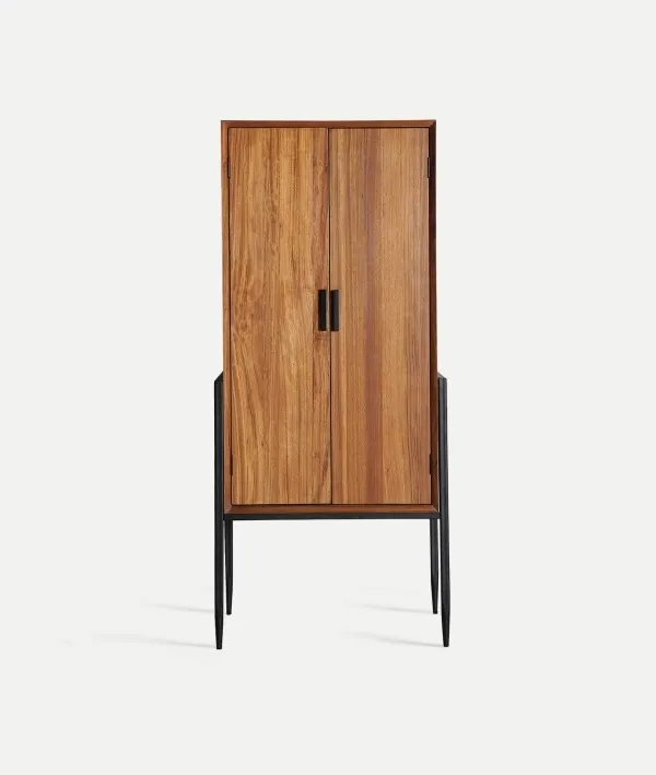 Armario de dos puertas en madera de abeto y patas en metal negro. Estilo contemporáneo.