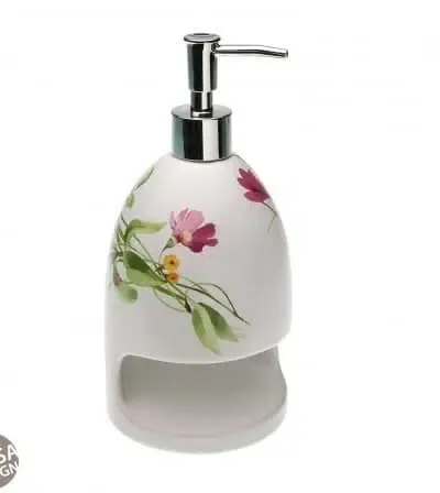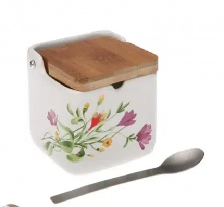 Azucarero en cerámica blanca con dibujos de flores en tonos lilas y verdes.Medidas 8.5×8.5x9cm. Estilo moderno