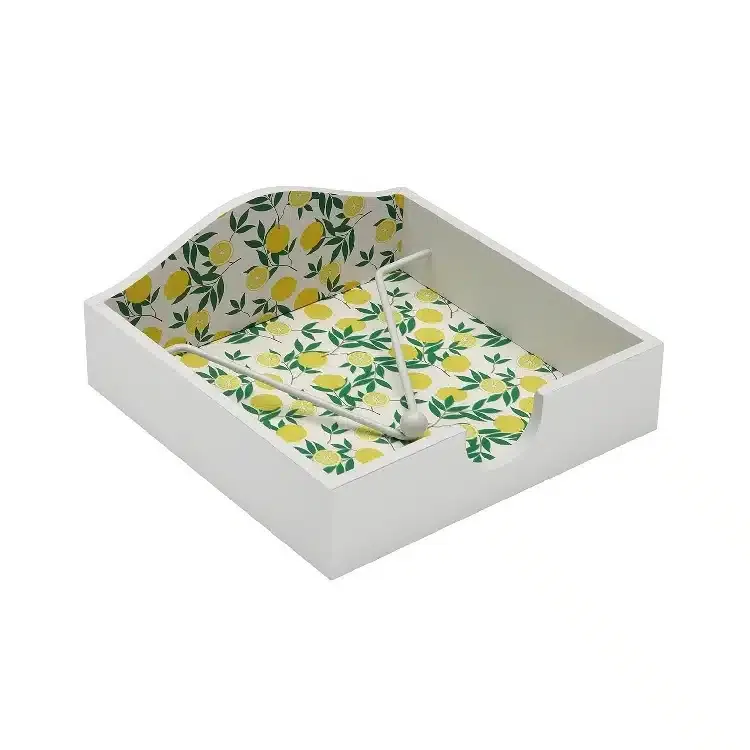 Azucarero en cerámica blanca con dibujo de limones en tonos a marillos y verdes. Tapa en bambú natural. Estilo vintage.