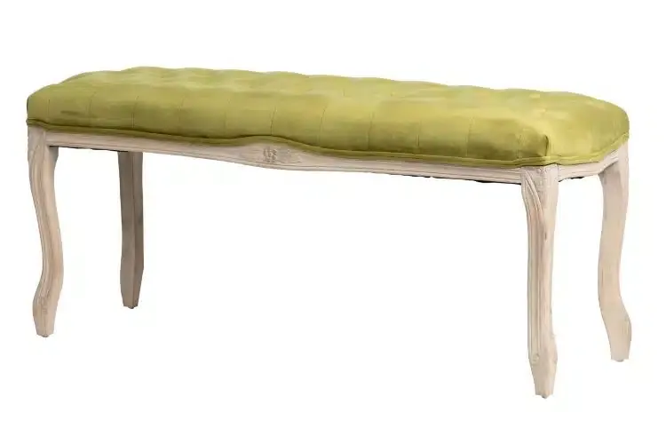 Banqueta en madera de caucho natural, tapizada con capitoné en tercciopelo verde. Estilo clásico.