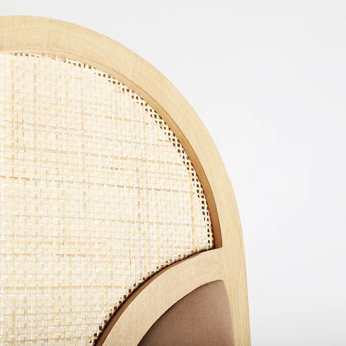 Formado por tres cuerpos ovalados en madera de pino, combinada con ratán trenzado y terciopelo teja.