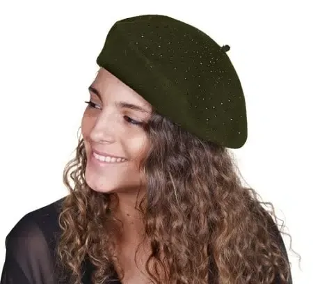 Boina con detalle fantasía en mini cristales, en color verde caqui. Medidas: 27 diámetro. Composición: 90% acrílico, 10% lana.