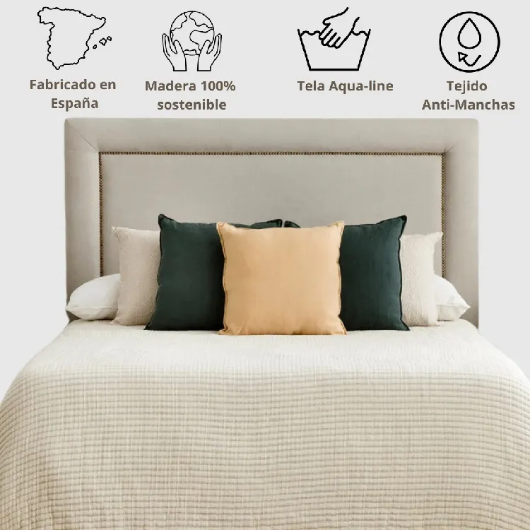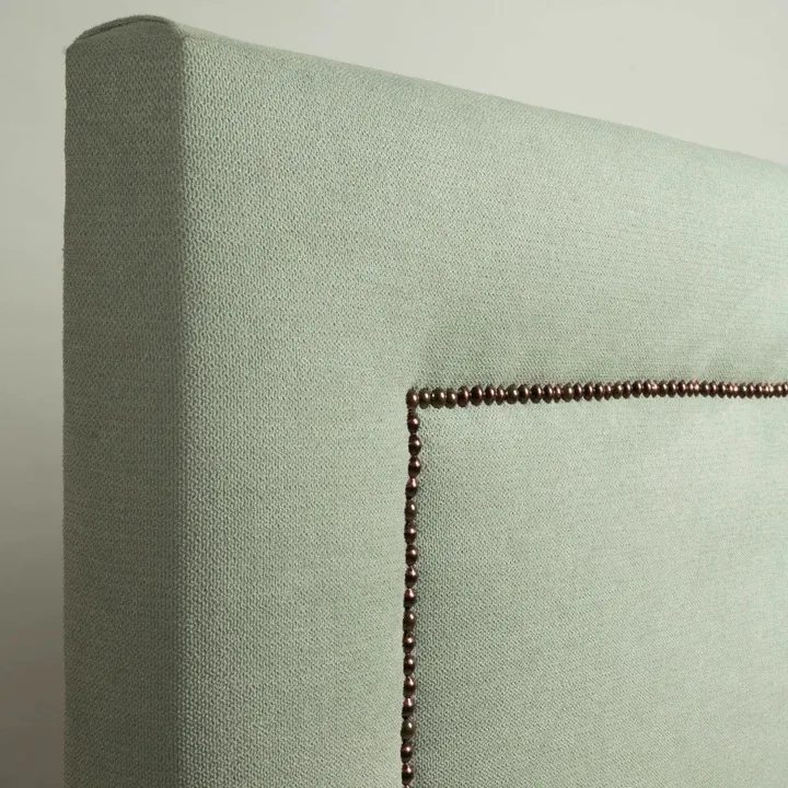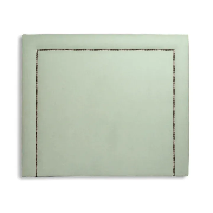 Cabecero acolchado y tapizado en tejido verde claro aqualine tacto aterciopelado, enmarcado con tachuelas. Estilo clásico.