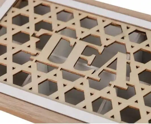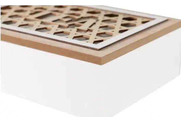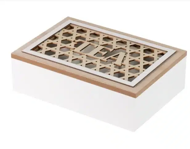Caja de té en mdf blanco con la tapa natural calada con motivos geométricos. Estilo vintage.