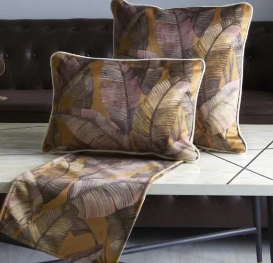 Camino de mesa en terciopelo con estampado de hojas de platanero en tonos mostazas.