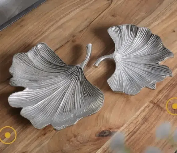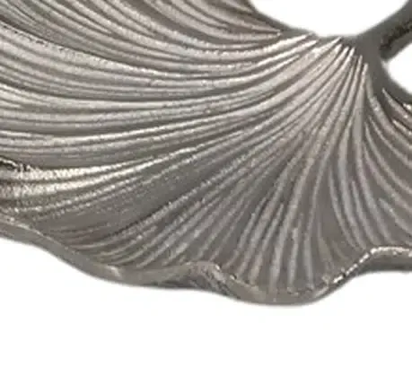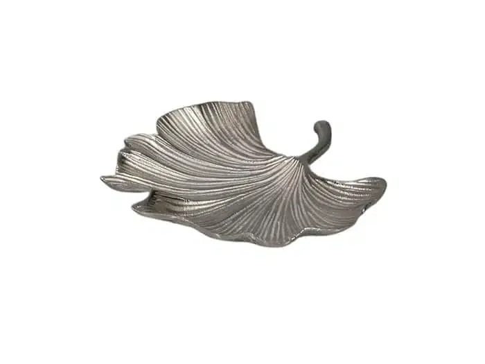 Centro de mesa en aluminio grabado plata con forma de hoja de Ginko.