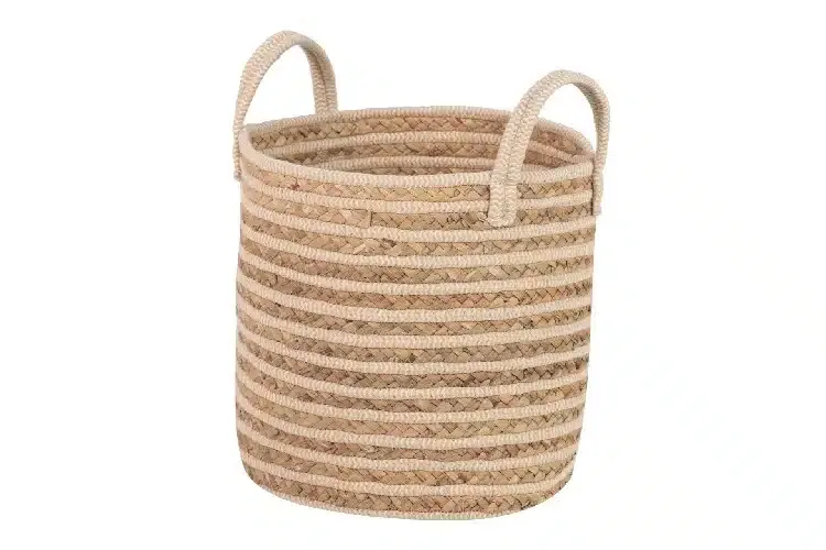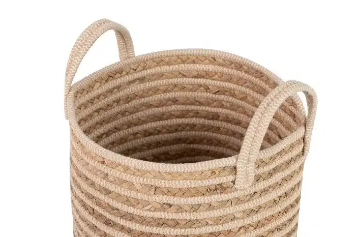 Apuesta por la natural con nuestra cesta en fibra natural trenzada combinada con algodón.