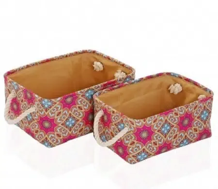 Set de 2 cestas en tela con estampado geométrico multicolor.Asas de cuerda.Interior forrado en tela.Medidas 25x35x16 cm.Consultar venta individual.