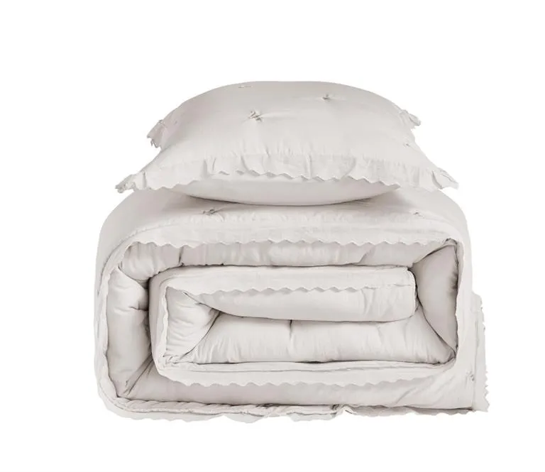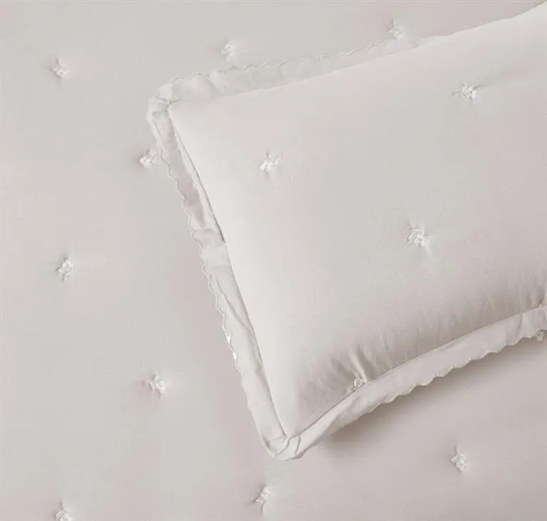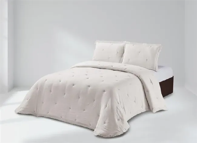 Colcha bouti natural ligeramente guateada con flores bordadas y cinta de encaje. Incluye dos funda de cojín.