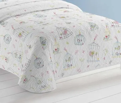 Colcha blanca en microfibra esmerilada, con alegres dibujos de pajaritos en tonos rosas.Composición 100%poliéster.Remate redondeado de esquinas.