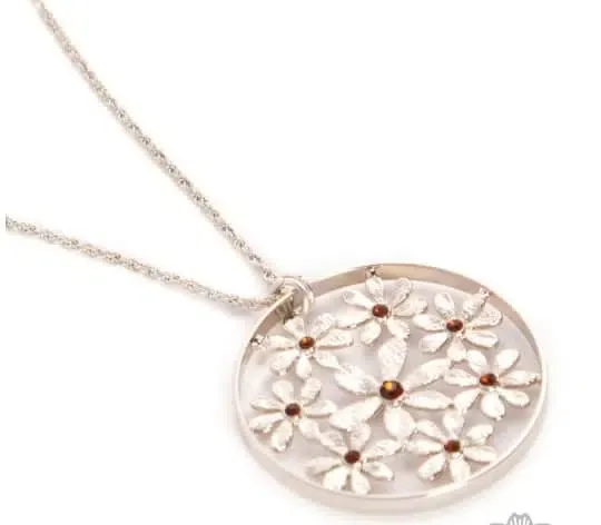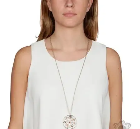 Collar largo con margaritas enmarcadas en centro redondo,Color: dorado. Composición: cristal, metal.Estilo moderno.