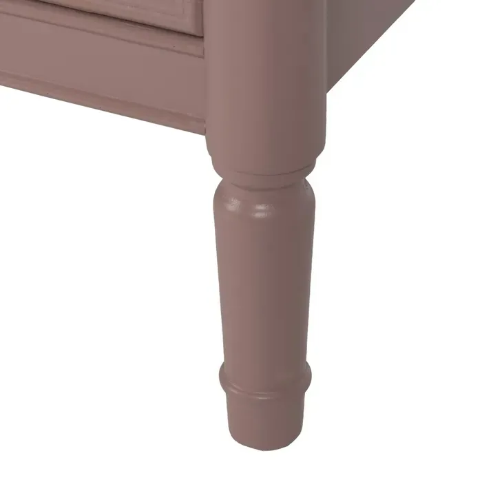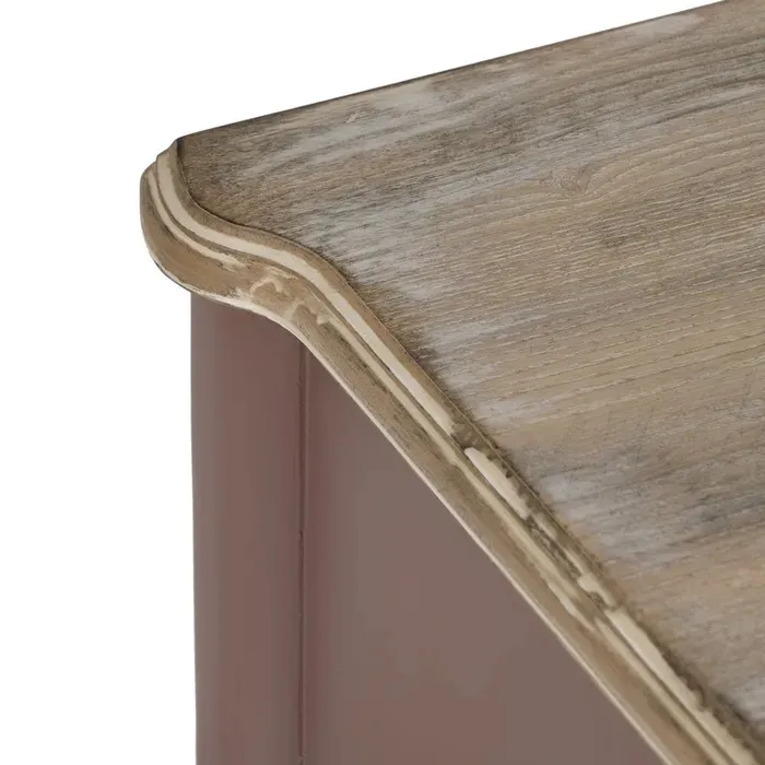 Fabricada en madera de abeto -mdf y terminada en un delicado color lila . La tapa suavemente ondulada en las esquinas es en madera natural desgastada con pátina en blanco.