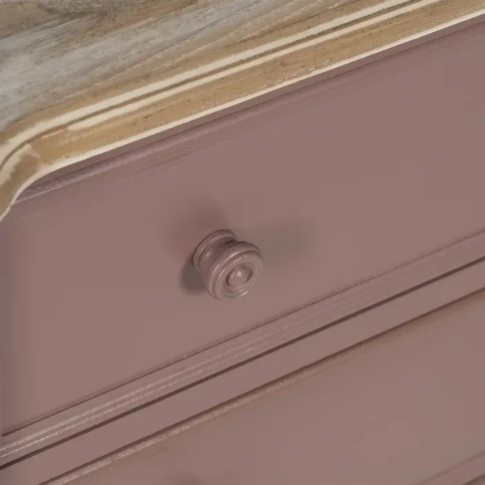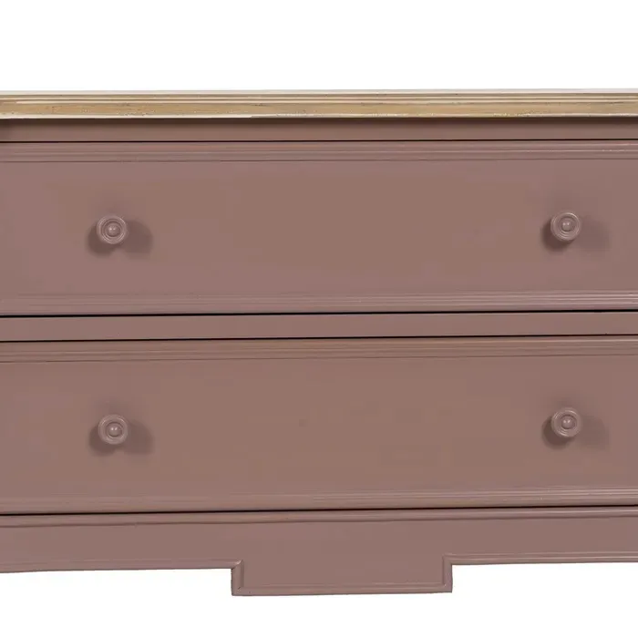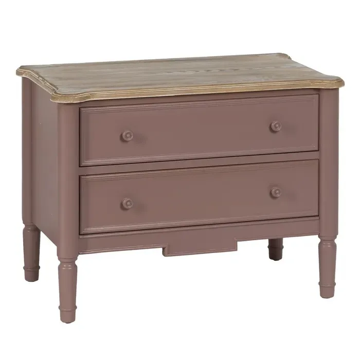 Cómoda de dos cajones en madera de abeto morada combinada con tapa en natural. Estilo clásico.