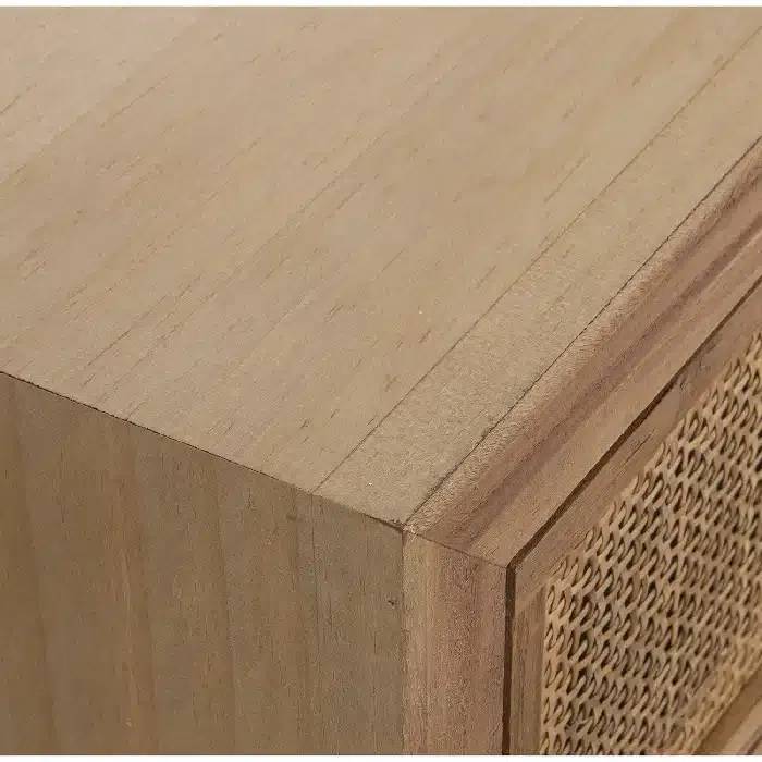 Fabricada en madera de pino-dm acabada en natural y combinada en el frontal de los cajones con rejilla de ratán.