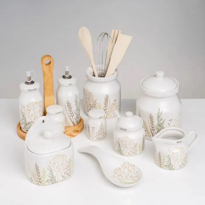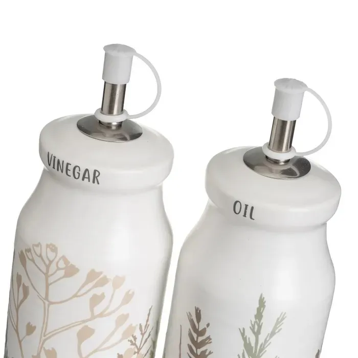 Convoy de aceitera y vinagrera en cerámica blanca con ramas verdes y grises Estilo vintage.