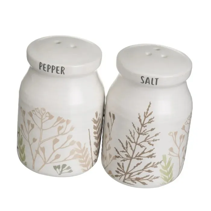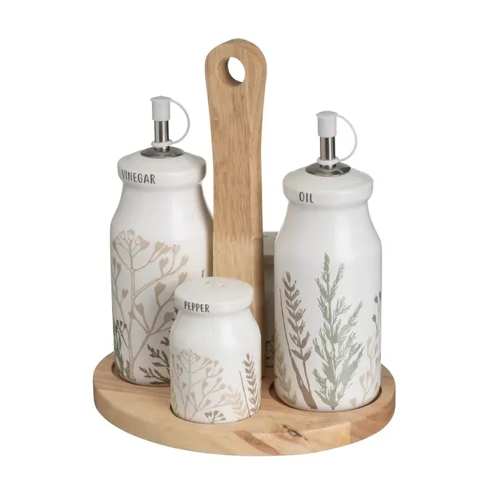 Da a tu cocina un aire vintage con este bonito convoy de aceitera y vinagrera.Fabricado en cerámica blanca stoneware con detalle de ramas en tonos marrones y verdes.Compuesto de cuatro piezas sobre una base de madera de abeto.Medidas aceitera y vinagrera 6,5dx18cm.Capacidad 280c.c.Salero y pimentero 5dx8cm.