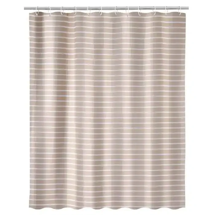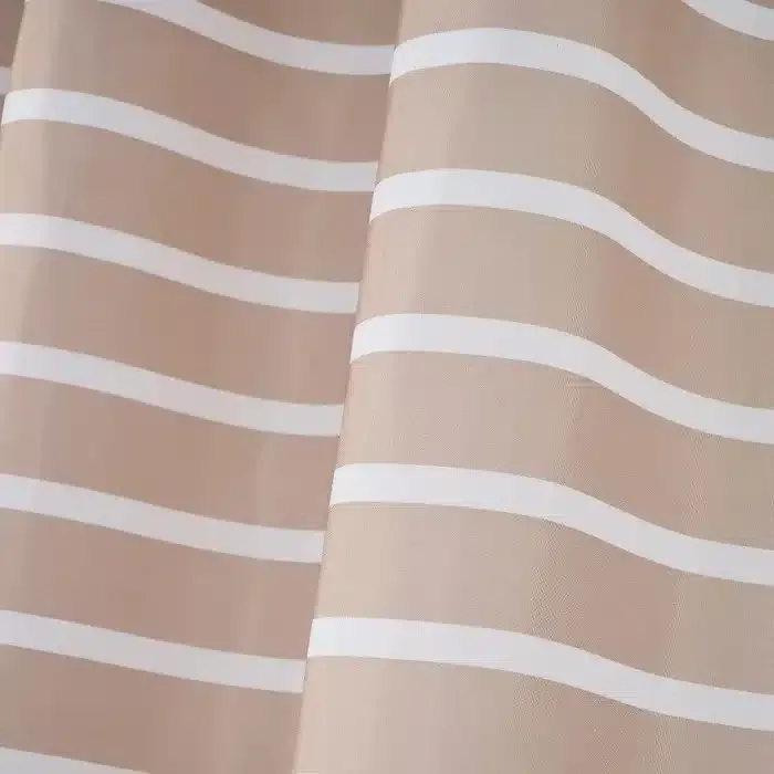 Cortina de baño en poliéster beige con estampado de líneas blancas.