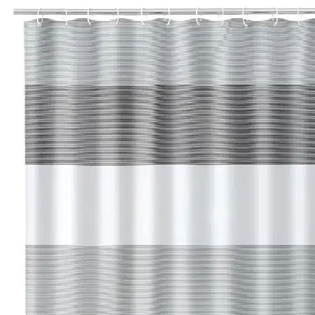 Cortina d baño en poliéster con dibujos de líneas grises y negras.Incluye 12 anillas blancas en polipropileno.Instrucciones de lavado: temperatura máxima 40º. No admite lejía ni limpieza en seco.No usar secadora Estilo moderno.Disponibles otros artículos de la colección.