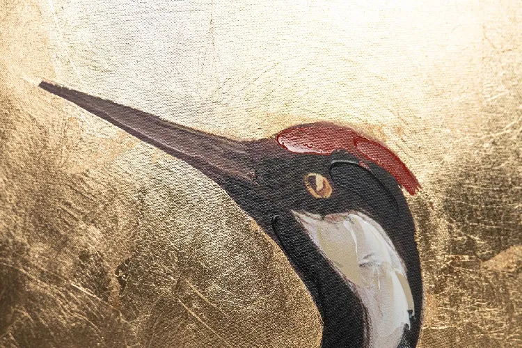 Cuadro sobre lienzo con dibujo de una elegante garza ne tonos blancos sobre fondo dorado. Técnica mixta: 80% a mano-20% impresión.