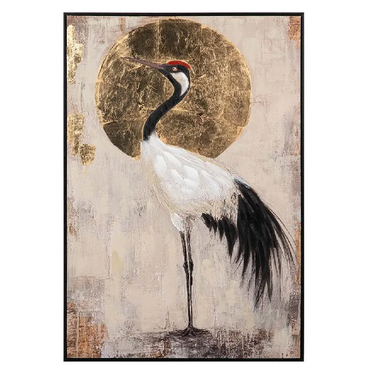 Cuadro sobre lienzo de garza blanca sobre fondo dorado y beige.Estilo clásico.