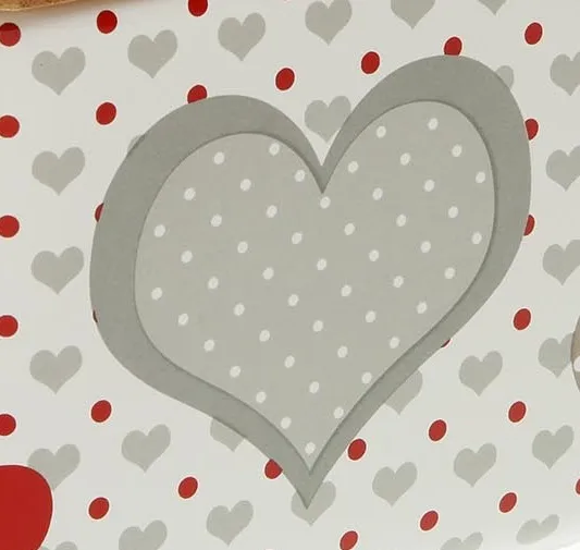 Fabricado en cerámica blanca con detalles de originales corazones en gris y rojo.
