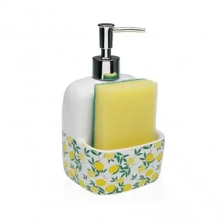Dosificador de cocina en cerámica blanca y motivos de limones en amarillo y verde.