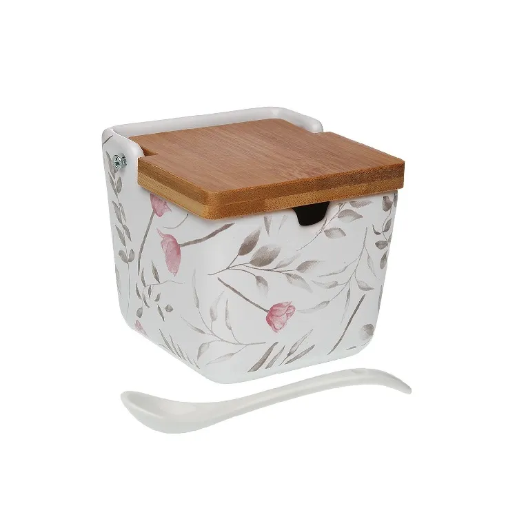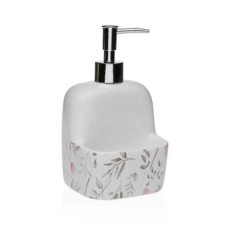 Dosificador de cocina en cerámica blanca y motivos de flores rosas y grises.