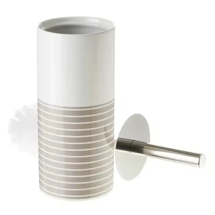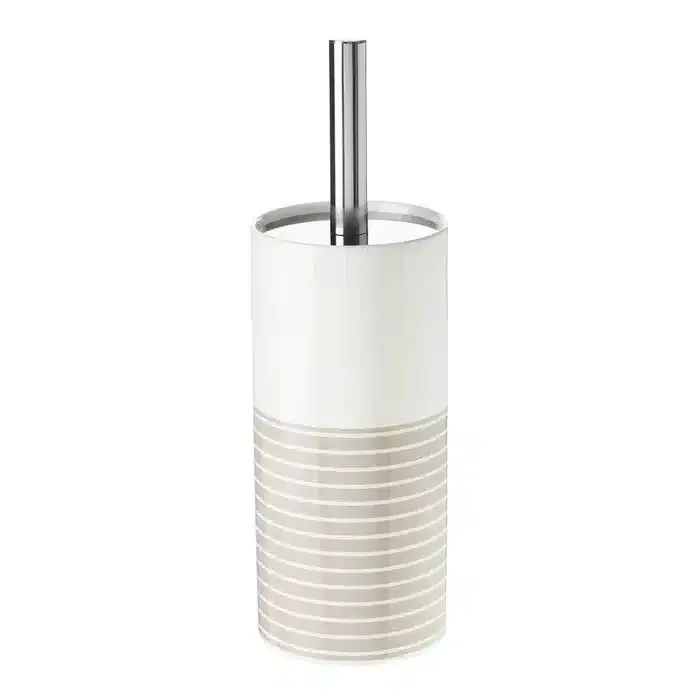 Escobillero en cerámica blanca con dibujo de líneas en beige.