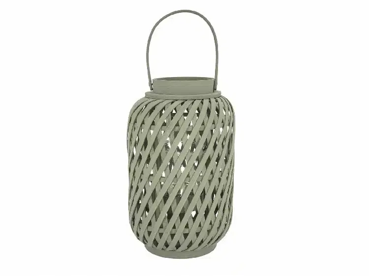 Farol portavelas en madera de paulonia verde trenzada. Incluye vaso de cristal. Estilo rústico.
