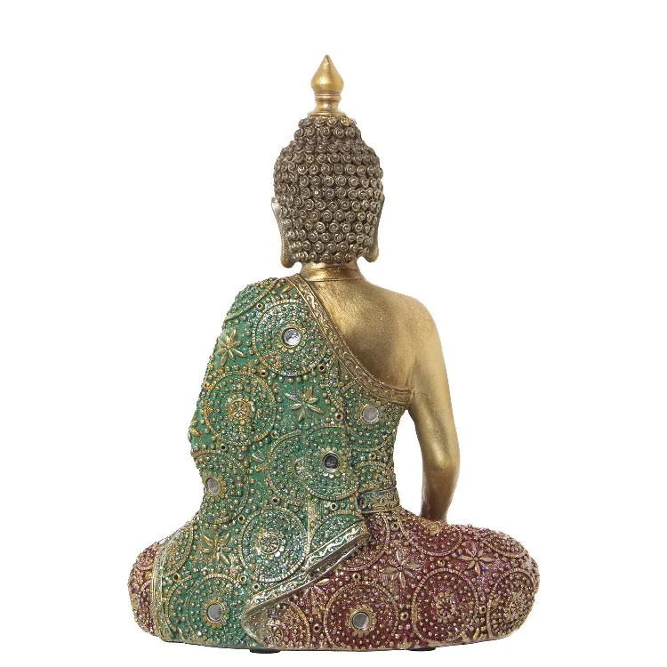 Figura de buda sedante en resina dorada con túnica grabada en rojo y verde.