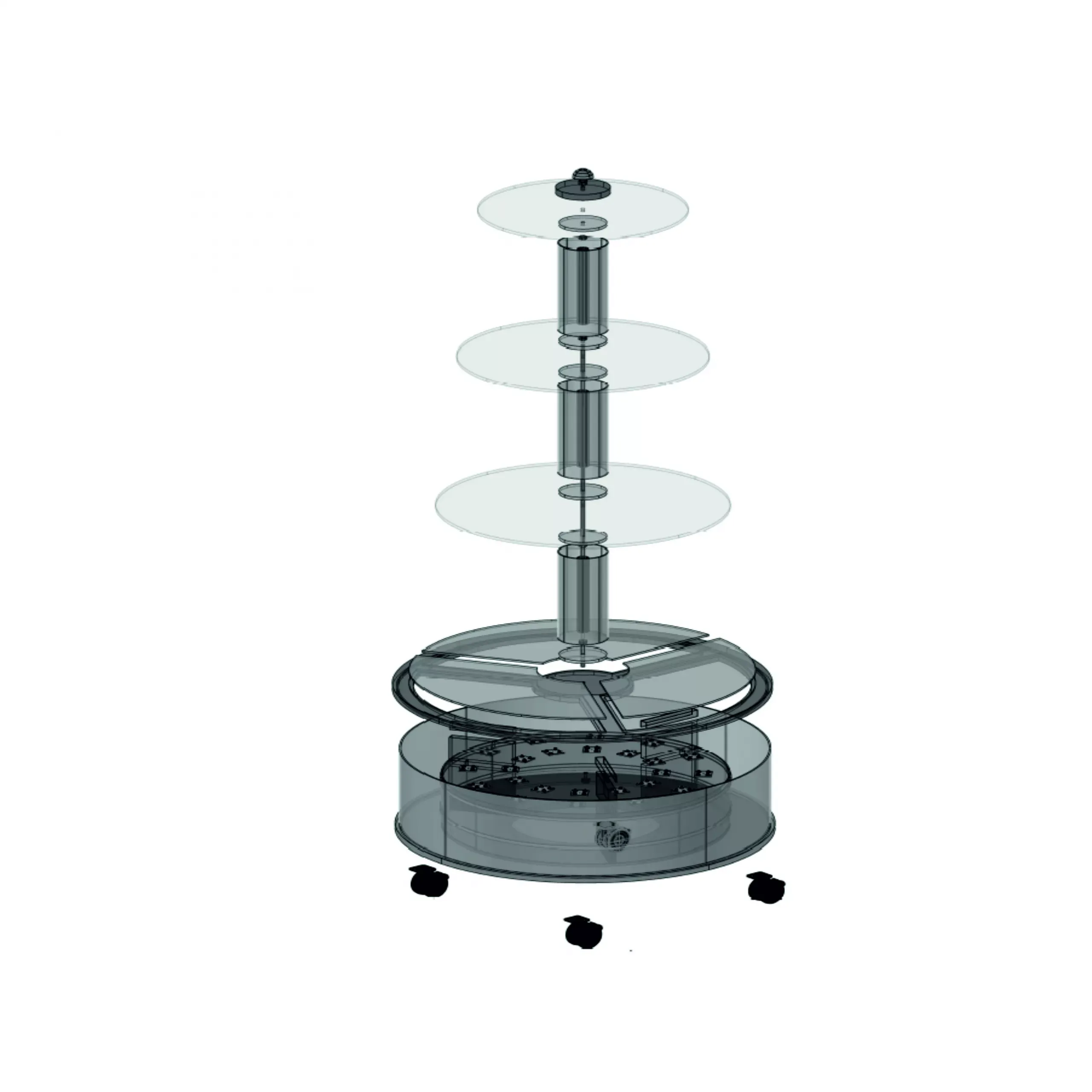 Con base en madera, columna central metálica y 3 alturas de estantes de cristal redondos. Posibilidad de varias medidas y alturas.
