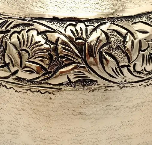 Jarrón en aluminio acabado en oro con detalle de cenefa con flores grabadas. Medidas 20dx16cm.Estilo clásico.
