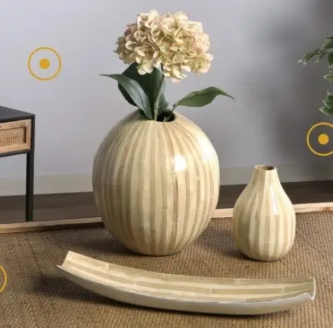 Jarrón de bambú con líneas en blanco y beige.Medidas 25dx28cm.Estilo moderno.