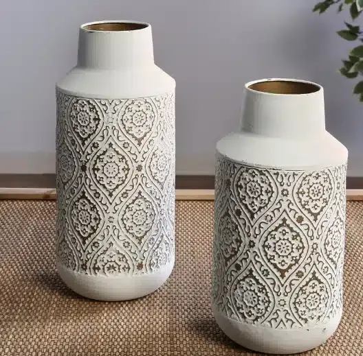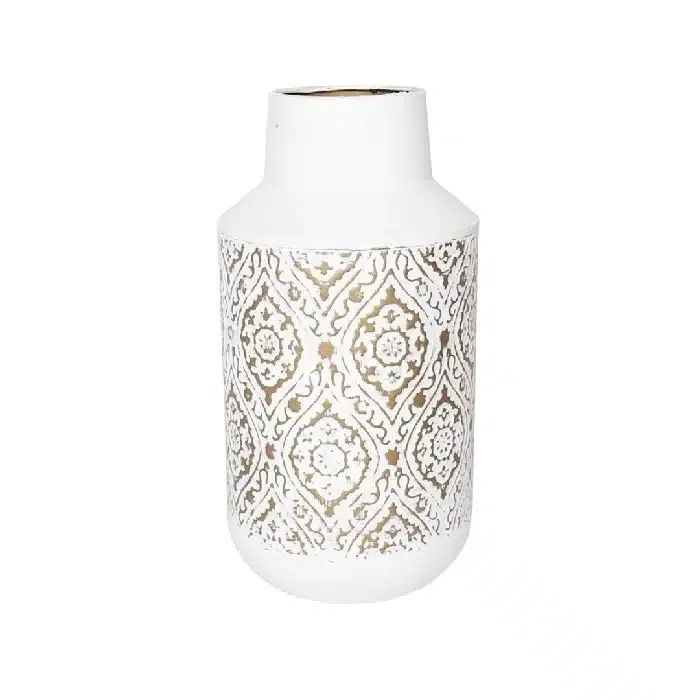 Jarrón Metal Blanco Grabado Dorados ( 16dx32 cm)