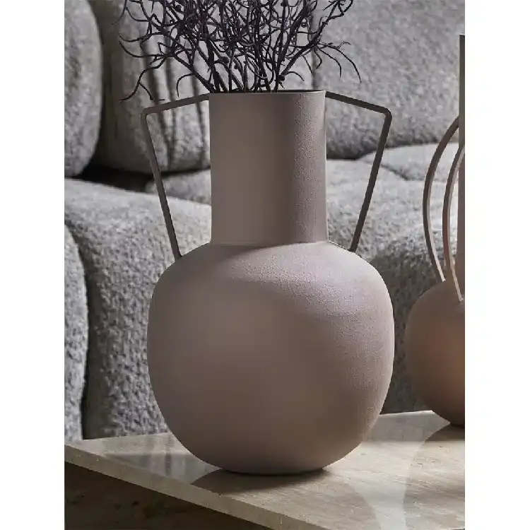 En la Colección Rodas encontrarás este original jarrón en metal rosa tipo ánfora y con asas laterales.