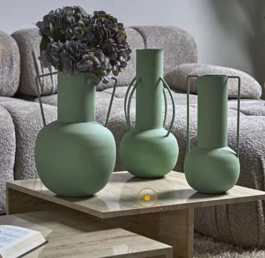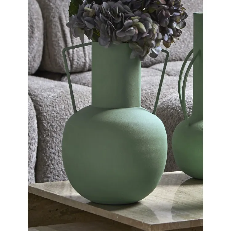 En la Colección Rodas encontrarás este original jarrón en metal verde con asas laterales.