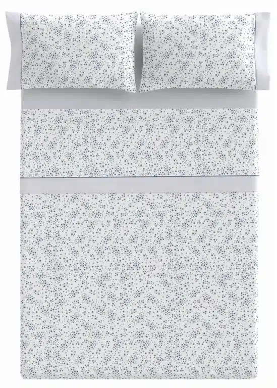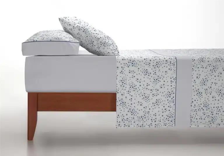 Alegre juego de sábanas de tres piezas con estampado de florecillas en tonos azules. Composición 48% algodón-52% poliéster.