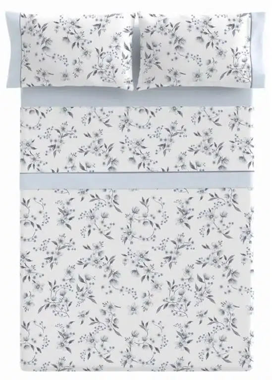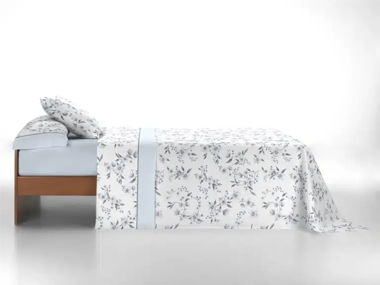 Alegre juego de sábanas de tres piezas con estampado de flores en tonos azules. Composición 48% algodón-52% poliéster.