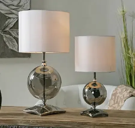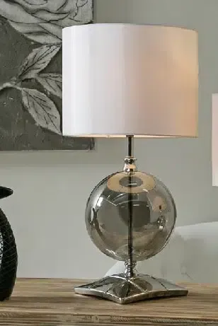 Lámpara de mesa con pie en metal plata y bola de cristal ahumado.Bombilla no incluida.Medidas: 26x26x51 cm.Estilo moderno.Consultar otros tamaños.