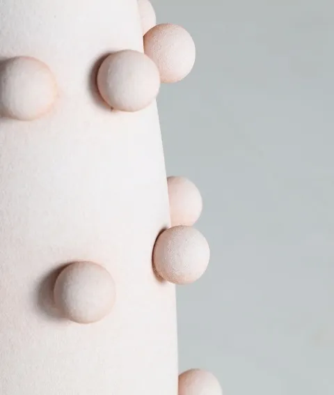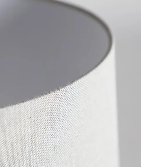 El pie está realizado en cerámica rosa palo con detalles de bolitas, combinada con metal plateado. La tulipa circular es de tela de lino en color gris claro.