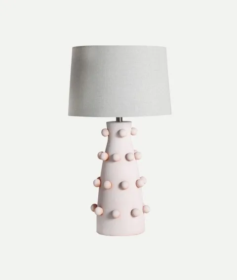 Lámpara sobremesa en cerámica rosa palo condetalles de bolitas. Tulipa en tela gris clarito. Estilo rústico.