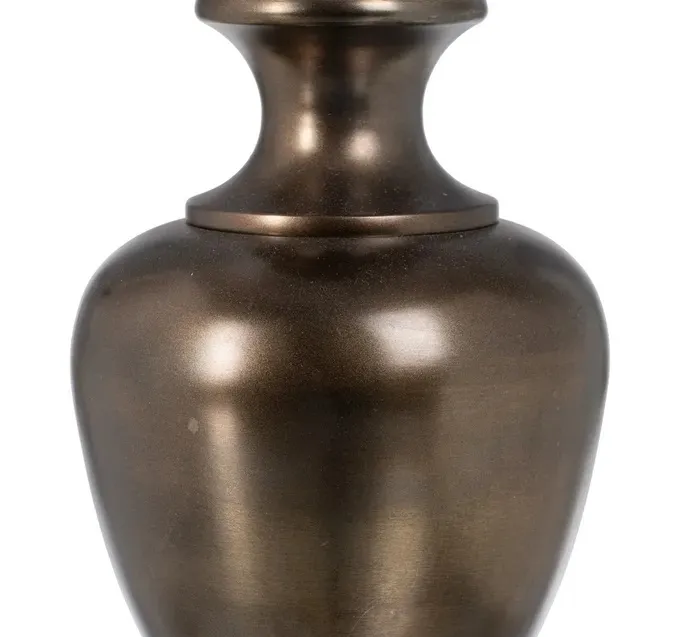 El pie torneado es de aluminio acabado en color bronce y descansa sobre una base cuadrada.