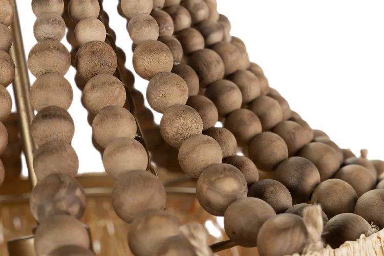 Fabricadas artesanalmente con cuentas de madera ensambladas y tintadas sobre una estructura metálica con detalles en yute y remtadas por unos originales flecos de rafia.