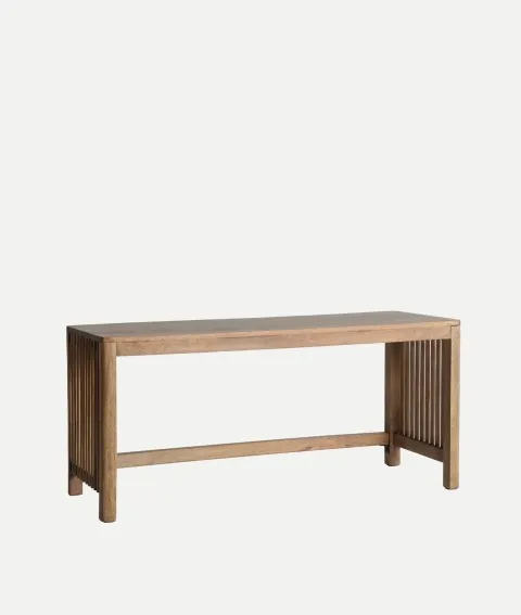 En ella encontrarás esta elegante mesa de centro fabricada en  madera de mango acabada en un bonito marrón veteado. Los laterales están rematados con listones de madera verticales.