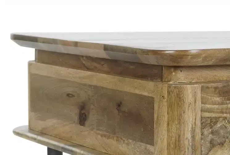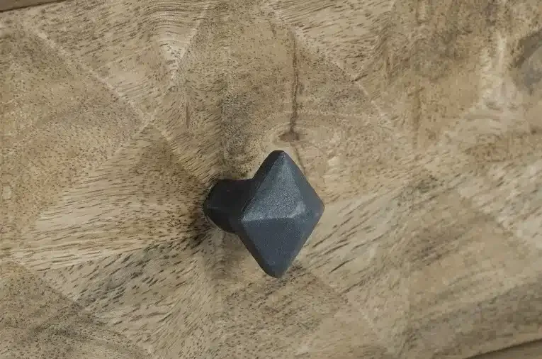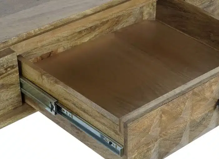 Su estructura rectangular de esquinas redondeadas, está fabricada en madera maciza de mango natural. Está equipada con un cajón central con rieles metálicos. Tanto el frontal del cajón como la parte trasera tiene un detalle en relieve de rombos grabados.