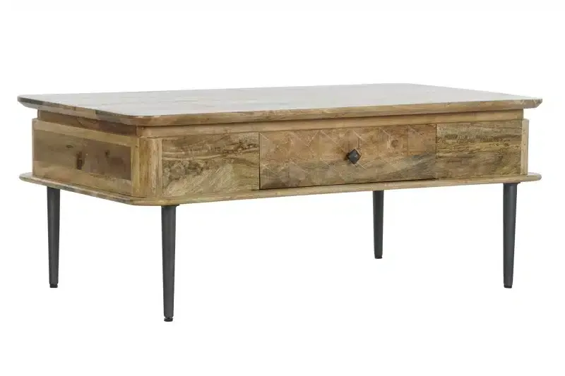 Elegante mesa de centro de estilo colonial en madera de mango con detalles gabados de rombos. Equipada con un cajón central.